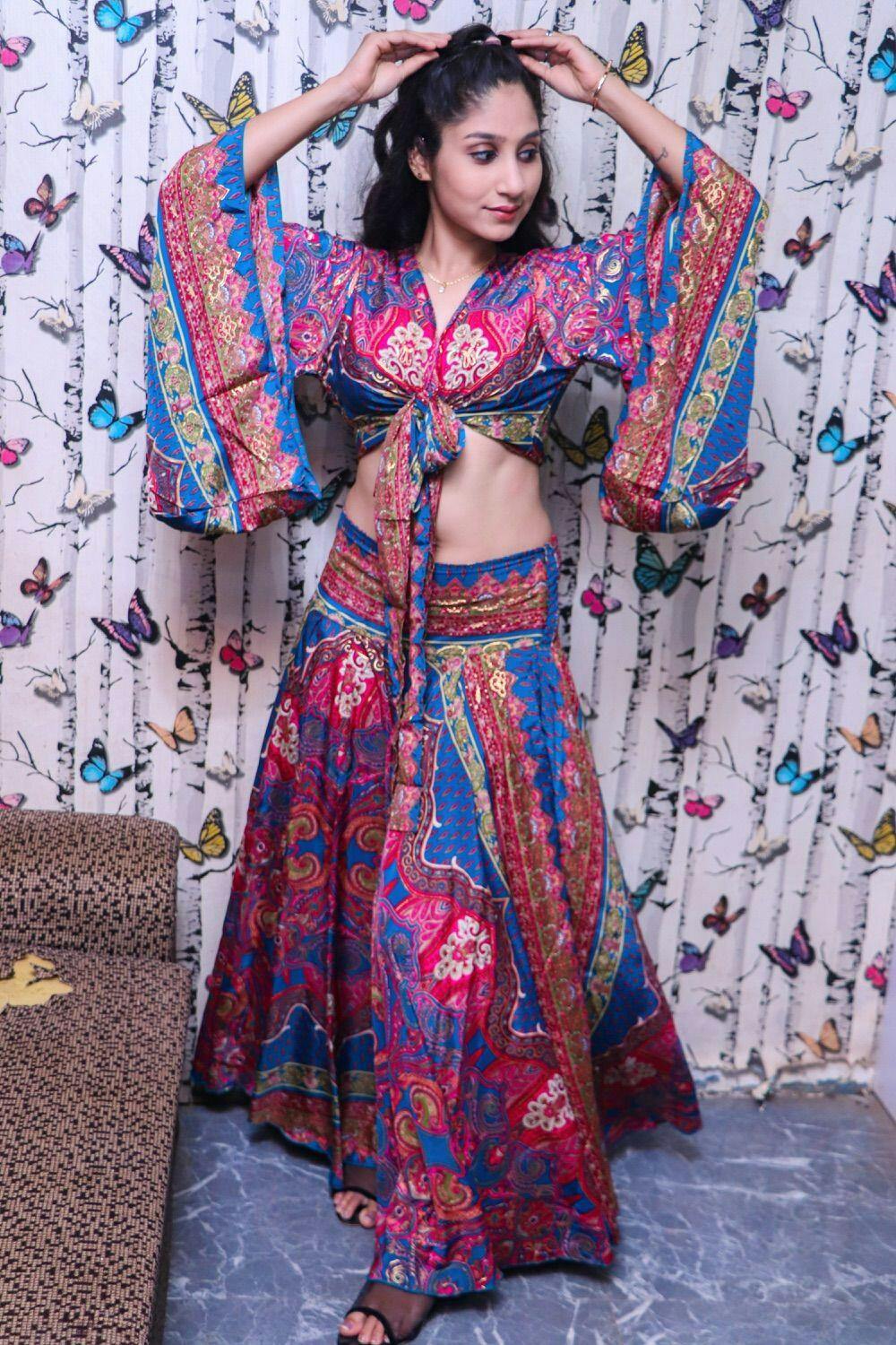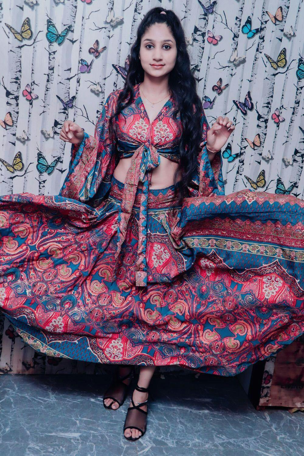 Embrace pastel romance in this pink and light puple paisley co‑ord set. The tie‑knot top bows front or back, while the lehenga skirt’s belt‑front and back smocking ensure a perfect contour. Style with floral hoops, strappy sandals, and a wide‑brim sunhat for garden soirées, boho brunches, or sunset strolls.