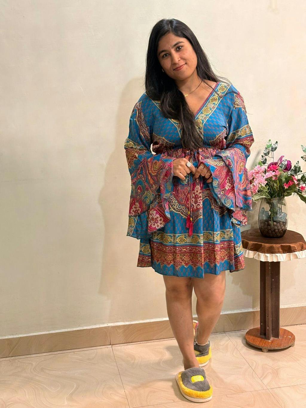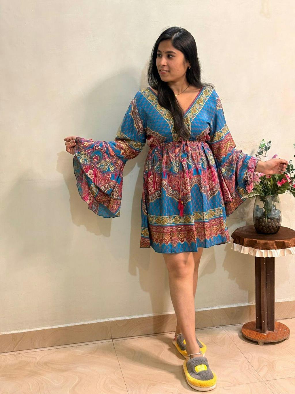 Twirl into romance with this brown boho V‑neck dress highlighted by purple hues and golden foil paisley prints. The elastic underbust offers stretch and shape, while layered bell sleeves bring flirty flair. Style with suede ankle boots, necklaces, and a woven clutch—ideal for art fairs, sunset picnics, or coffee dates.