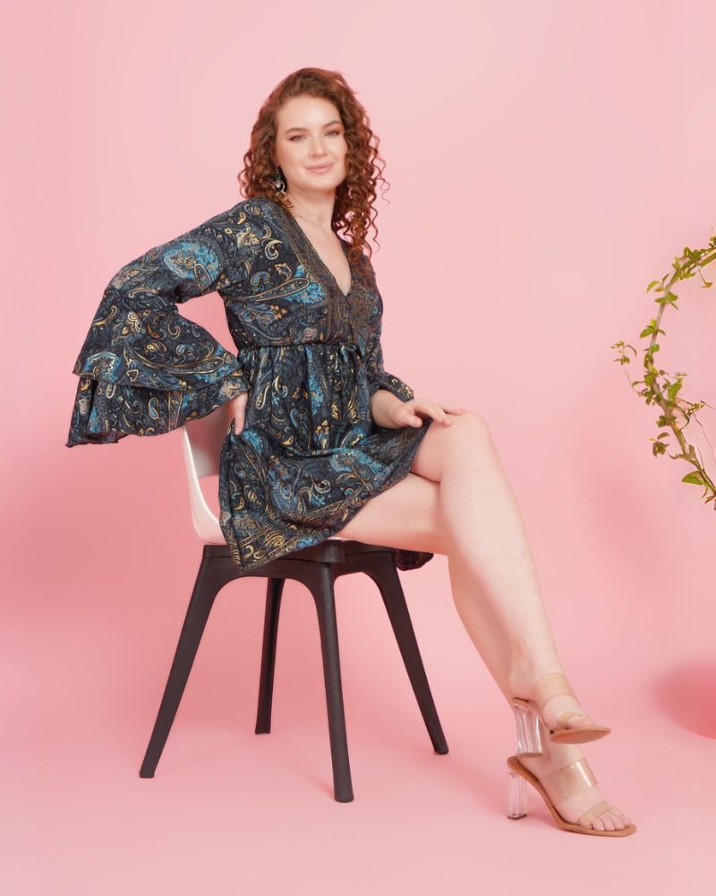 Dive into boho chic with this black short dress featuring blue hues, golden foil, and all-over paisley prints. The V-neck, elastic underbust, and layered bell sleeves add comfort and flair. Pair with silver hoops, ankle boots, and a sling bag—perfect for brunch dates, art pop-ups, or music-filled evenings out.