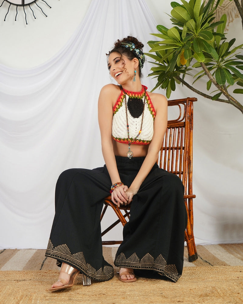 Own your edge in the Noir Ember Palazzo Pants, crafted in breathable organic cotton. This inky black silhouette features golden handblock sun motifs and zigzag hems that shimmer subtly against its midnight canvas. With a side-smocked elastic waist and statement pockets, these wide-leg pants are where boho soul meets moonlit glam. A timeless mood with everyday ease. Pair these black beauties with mirror-work tops or bold crochet for a moon-child moment