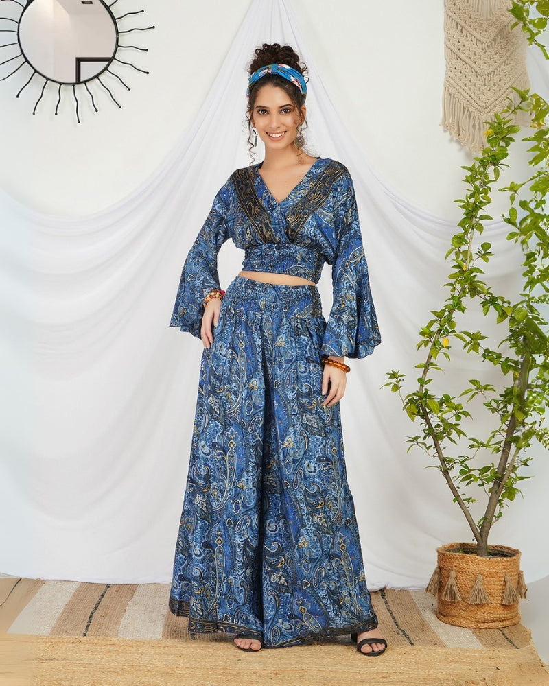 Embrace bohemian elegance with this sapphire blue co-ord set, detailed with golden paisley and midnight navy accents. The V-neck top flatters with an elastic bust and graceful bell sleeves, while the wide palazzo pants with an easy waistband create flowy comfort. A dreamy mix of bold hues and relaxed boho charm.