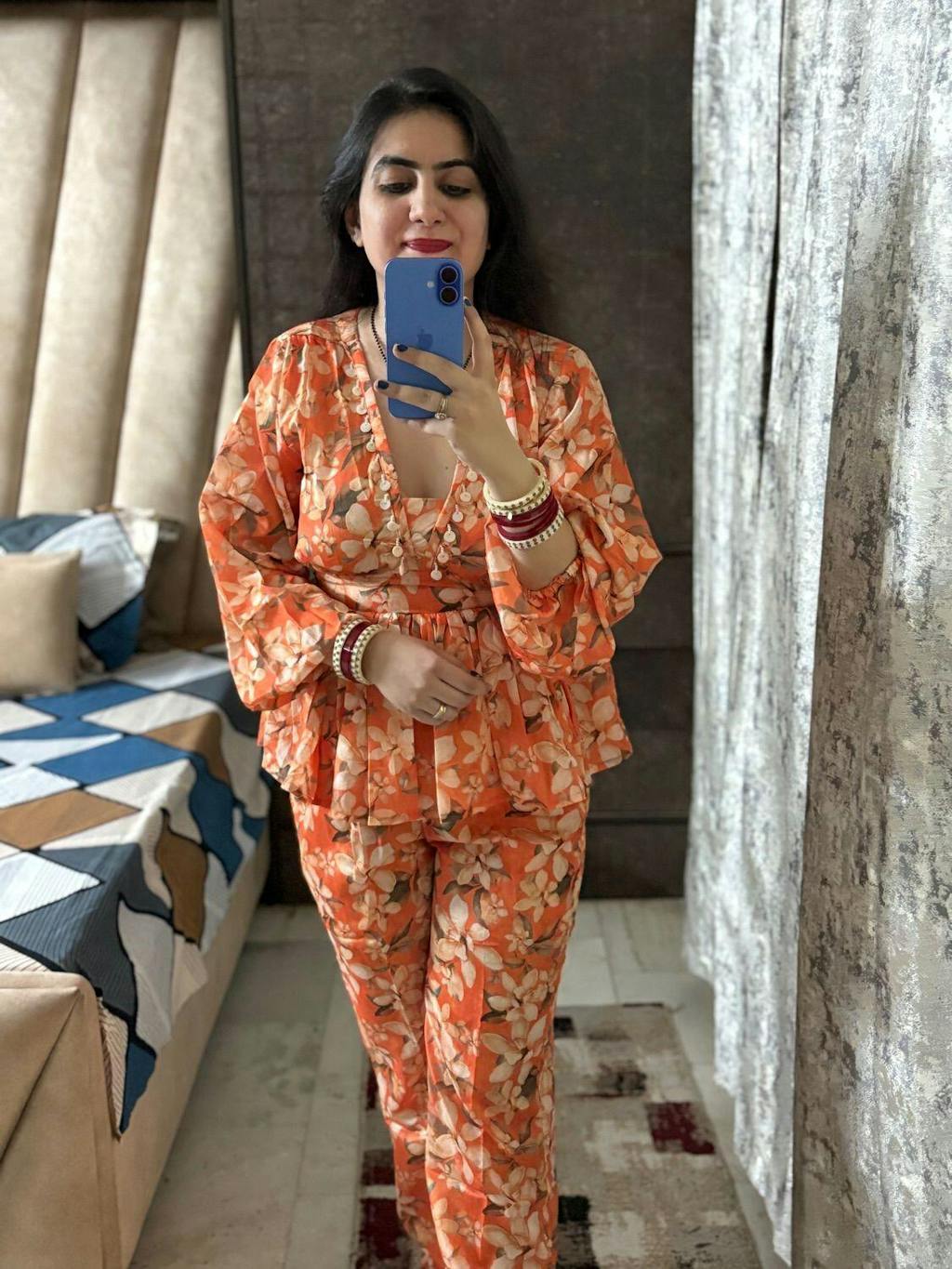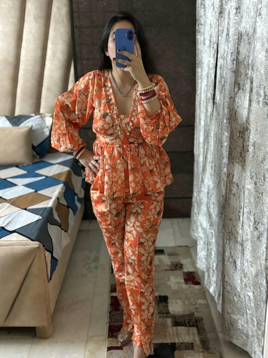 This vibrant orange floral co-ord set exudes boho charm with its peplum top, detailed with sea shell embellishments along a plunging V-neckline. The long peasant sleeves and elastic back ensure comfort, while wide-leg trousers with side pockets add practicality. Pair with espadrilles, woven bag, and hoop earrings. Perfect for beachside dinners, garden parties, or weekend getaways.