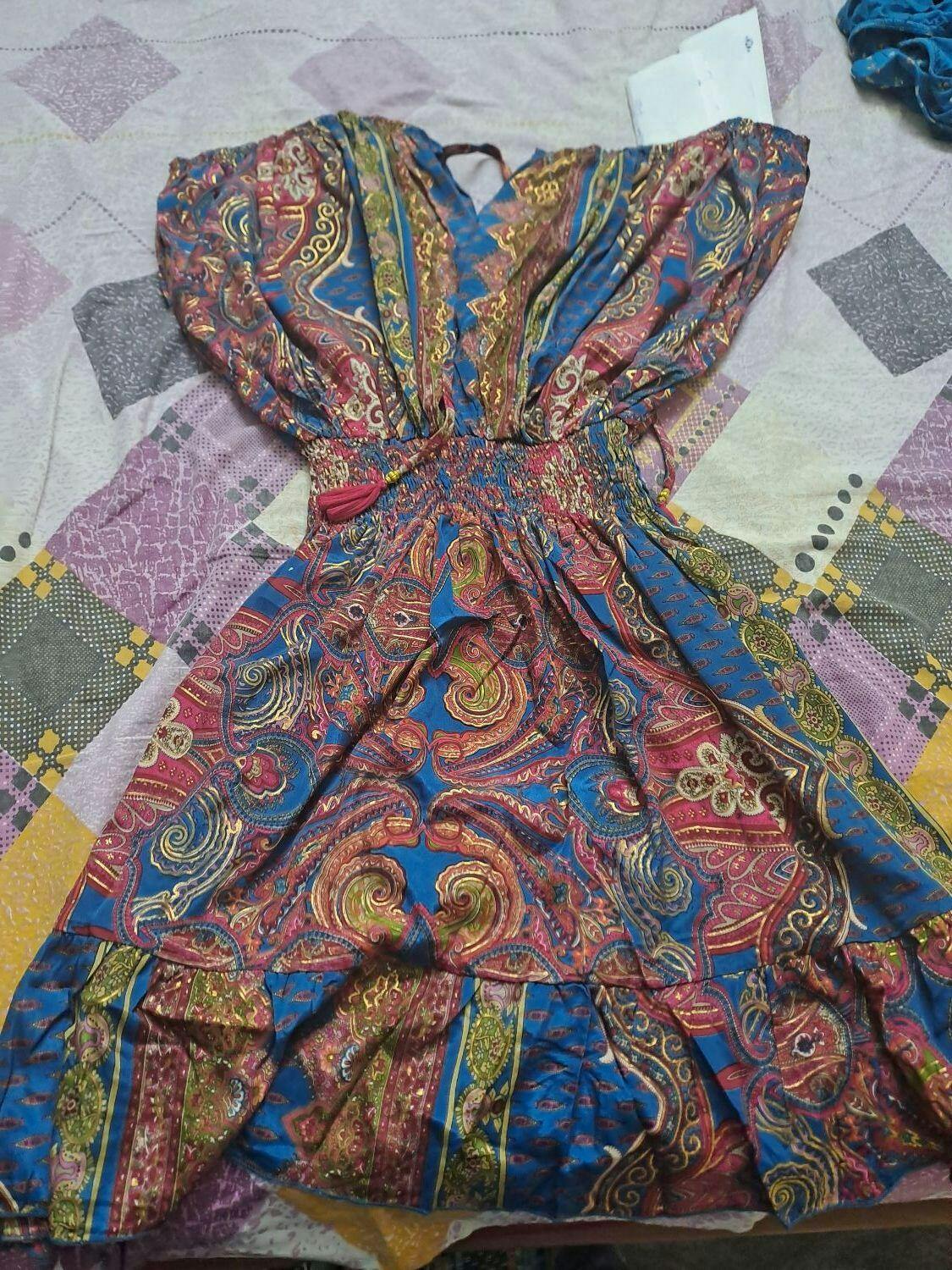 Channel your inner diva in this sultry black mini dress, kissed with turquoise hues and shimmering golden foil paisley prints. Voluminous balloon sleeves drape like couture, while a tie‑knot back cinches your waist. Style with metallic heels, statement silver hoops, and a fringe clutch for VIP nights or art soirées.