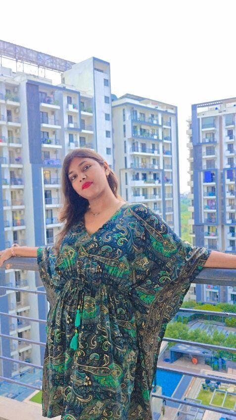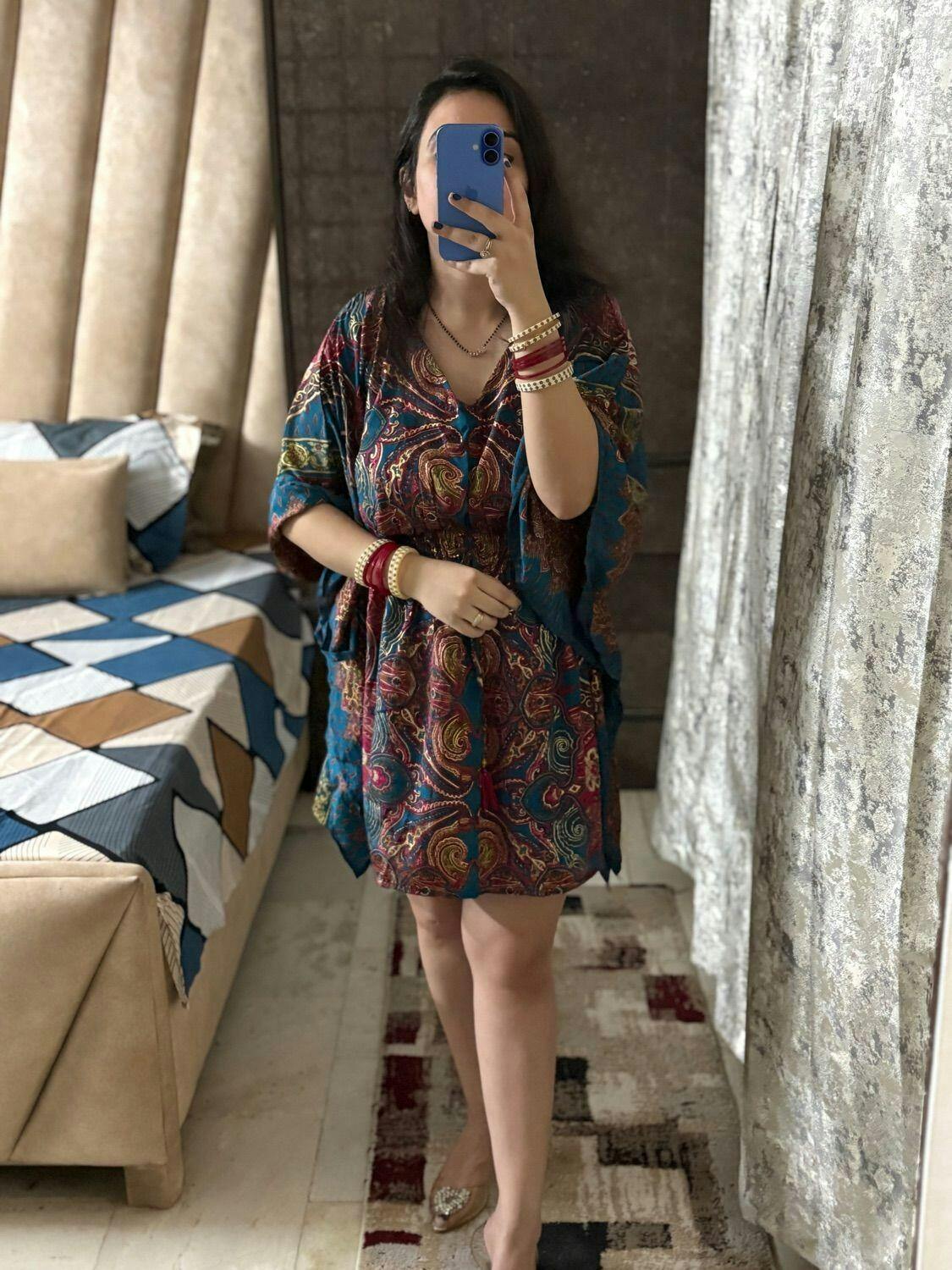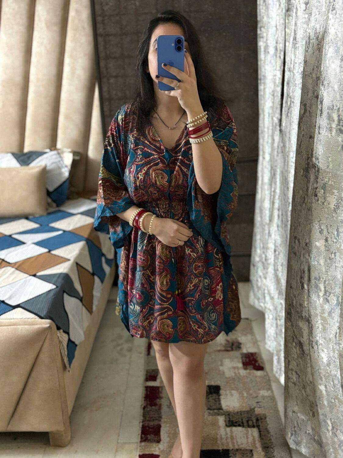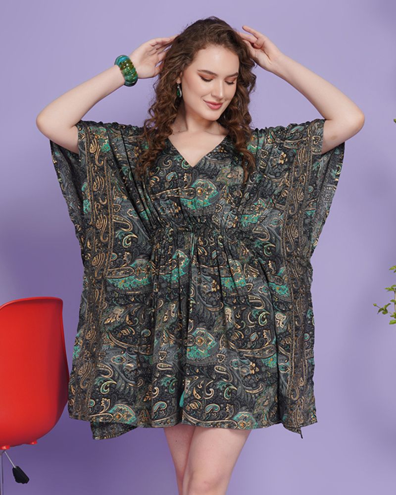 Glide into goddess mode with this stunning boho kaftan dress, awash in mystical jade green, deep charcoal black, and sprinkled with intricate gold foil paisleys. The easy-breezy kimono sleeves, cinched drawstring waist, and floaty silhouette are designed to flatter every curve while keeping it effortlessly free-spirited.