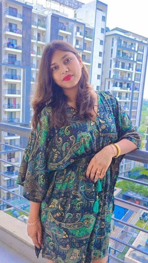The model with bust size 34", waist 24", hips 36" and height 5'8'' is wearing a free size dress