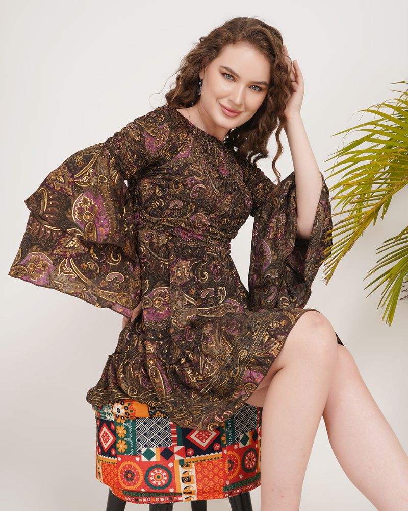 Drift into bohemian beauty with this smocked-stone brown mini dress, streaked in regal plum and kissed with golden paisley foil. Off-the-shoulder layers cascade into flirty bell sleeves and a playful ruffled hem. Pair with suede booties, amber hoops, and a crossbody bag—perfect for artsy soirées, coffee dates, or sunset strolls.