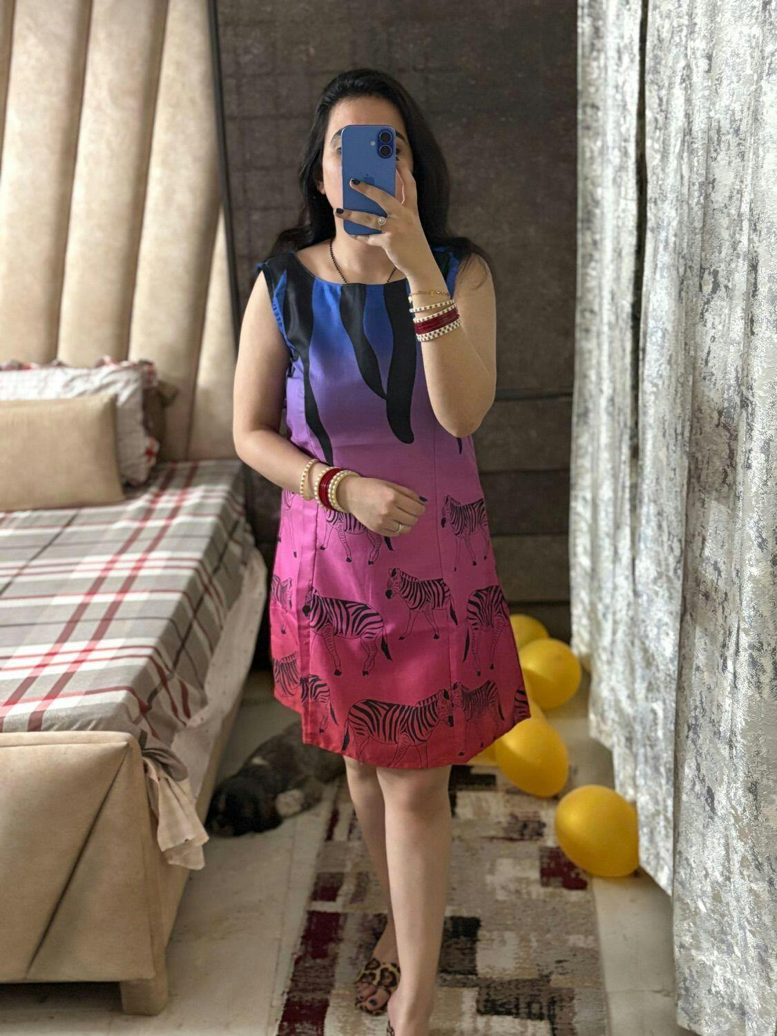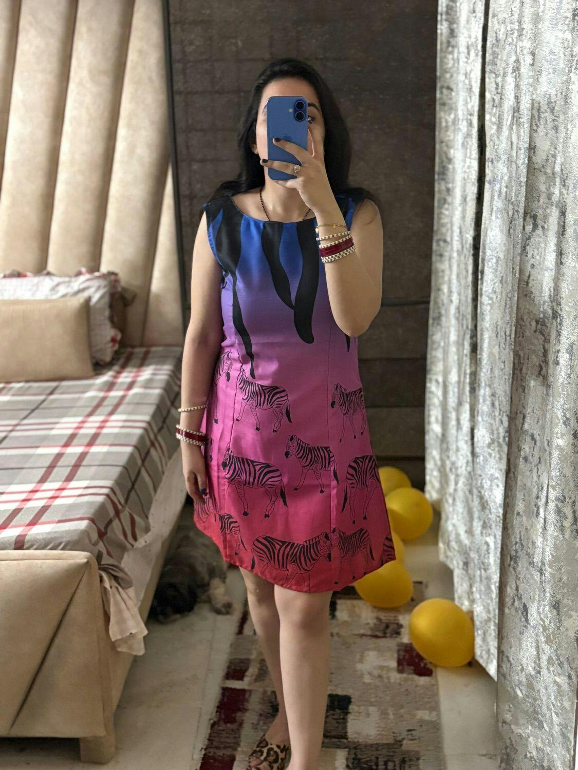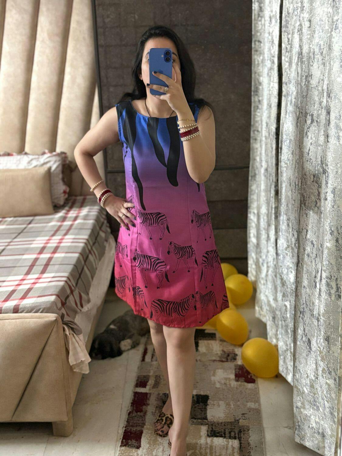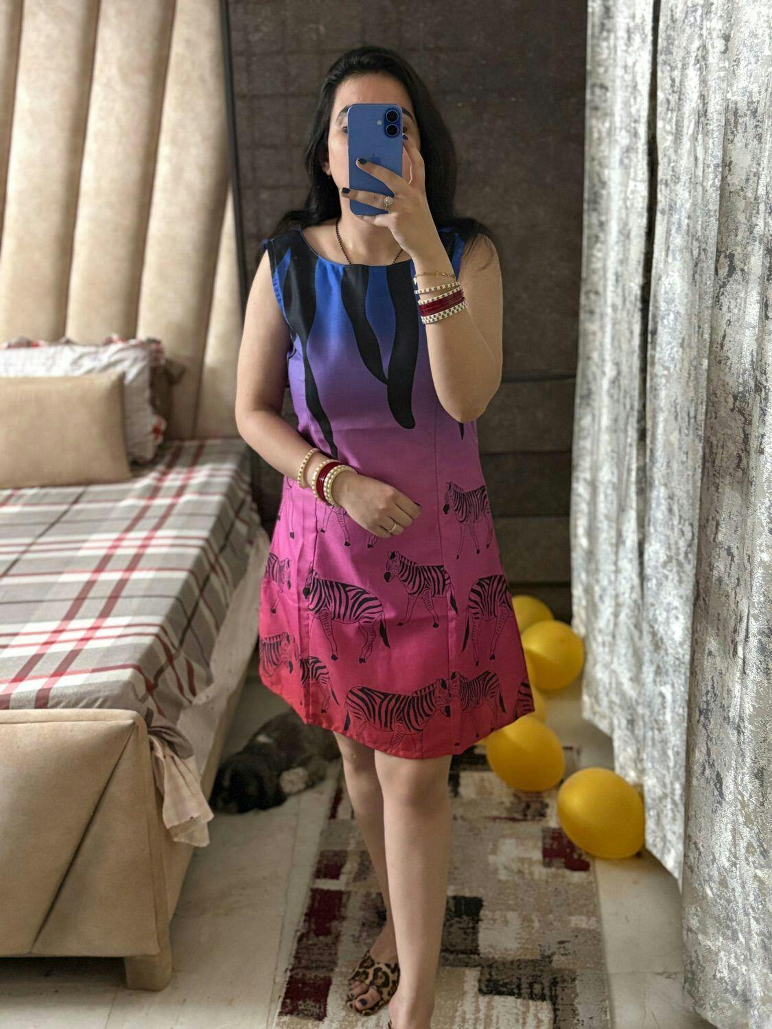 Infuse wilderness allure into your look with this sleeveless dress in vivid blue, pink, and red zebra print, featuring a back zipper for a tailored fit. Pair it with strappy sandals or sneakers and a wide-brimmed hat for an adventurous flair. Ideal for outdoor festivities, embodying a spirited, untamed charm.