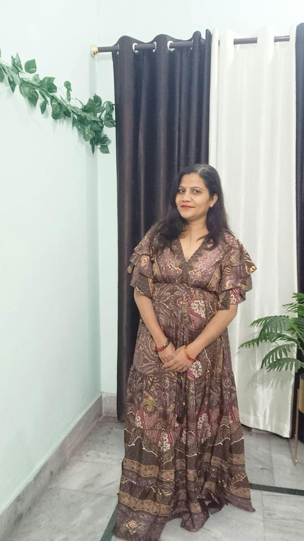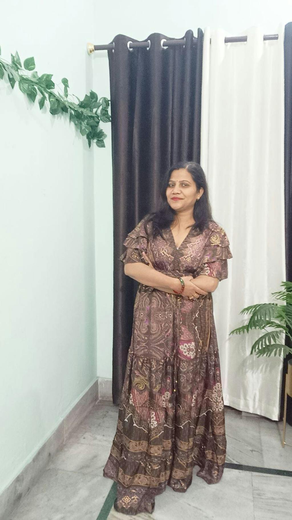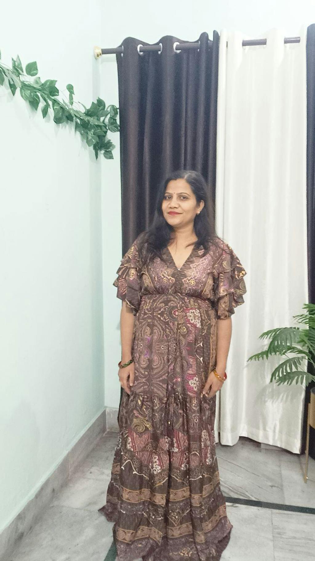 Drape yourself in earthy elegance with this boho tiered maxi dress, bathed in rich chocolate brown, kissed with hints of plum and bronze paisley swirls. Layered frill sleeves add whimsical charm, while subtle gold foil glimmers with every twirl. The flowy tiered silhouette and drawstring waist make it a breezy yet statement-making choice for any bohemian outing.