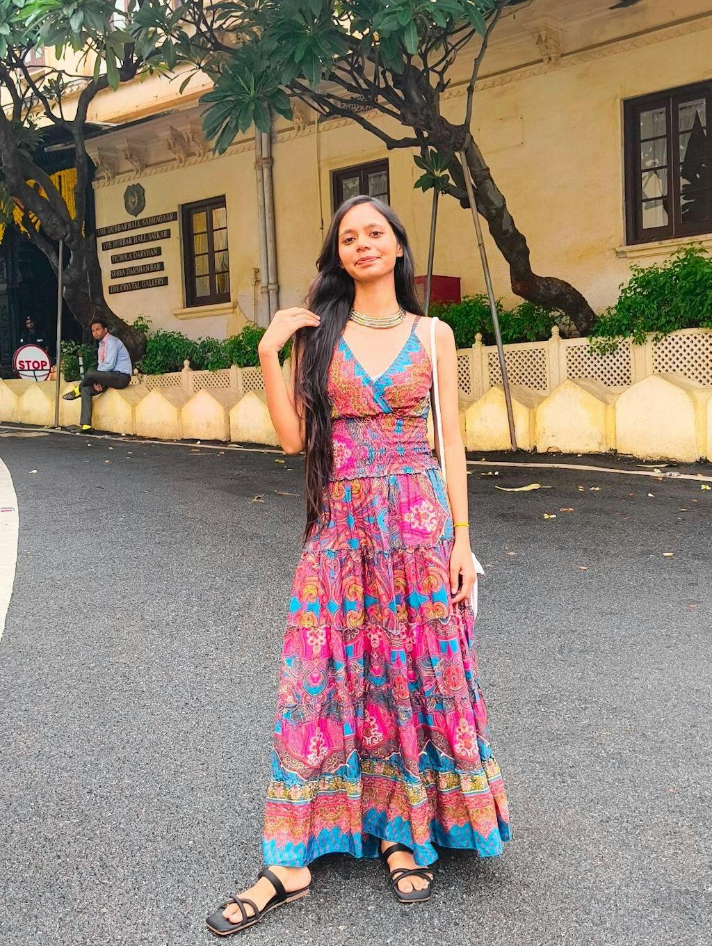 Make a statement with this navy blue bohemian maxi dress featuring golden foil teal paisley prints. The adjustable spaghetti closure and full smocking below the bust create a flattering fit. The tiered, flowy hem adds a touch of elegance. Pair with strappy sandals, a woven bag, and layered jewellery for beach days, garden parties, or evening soirees.