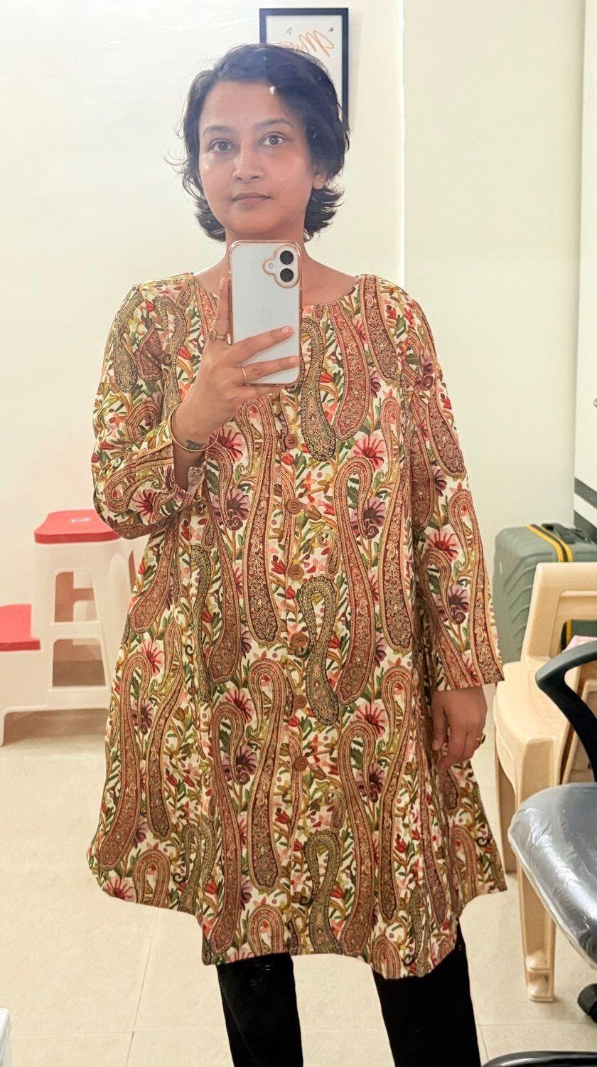 Elevate your style with this spun wool A-line dress featuring a vintage green paisley print and practical side pockets. Pair it effortlessly with high boots and short jacket for a chic winter look. Perfect for outdoor outings, casual gatherings, or evening events, offering both sophistication and beauty.
