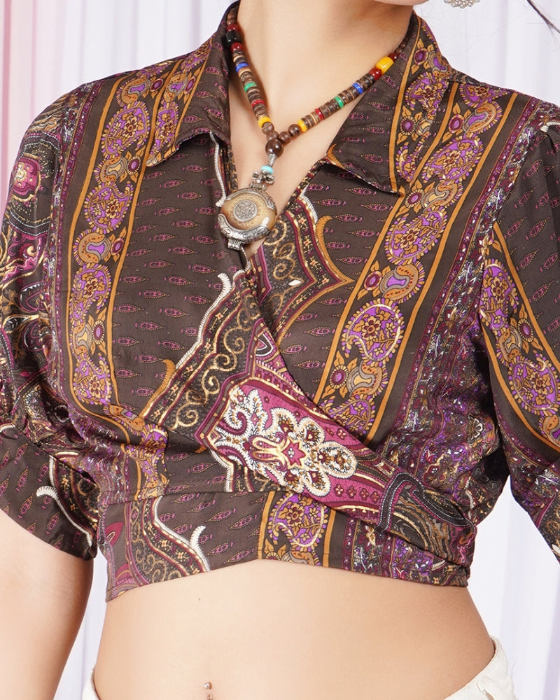 This bohemian collared tie-knot top brings bold charm with its rich Mocha-Plum paisley swirl and soft metallic accents. The lightweight, quick-dry fabric needs zero ironing and fits multiple sizes effortlessly. Style it tied in front for a playful edge or at the back for a sleek, sculpted look.
