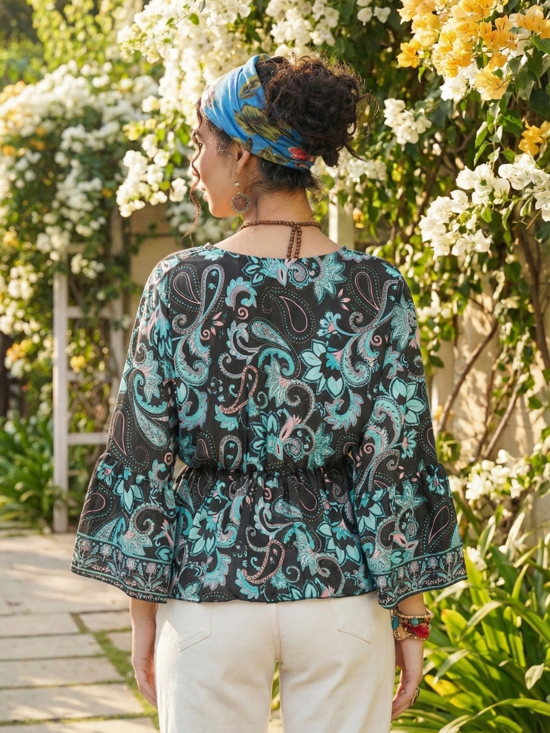 This bohemian peplum top pops in midnight-black with aqua mint swirls and dreamy paisley blooms. The lightweight, quick-dry fabric needs zero ironing, keeping it effortlessly fresh. A soft V-neck and tiered bell sleeves add playful movement, while the elastic waist shapes a flattering silhouette perfect for every free-spirited day.