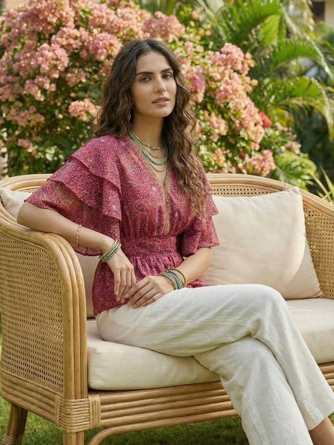 Style this bohemian peplum with layered bead or oxidised necklaces, stacked bangles, breathable linen trousers, and finish with tan flats or block heels for an effortless, sun-ready look.