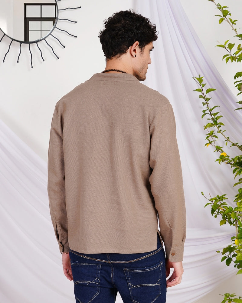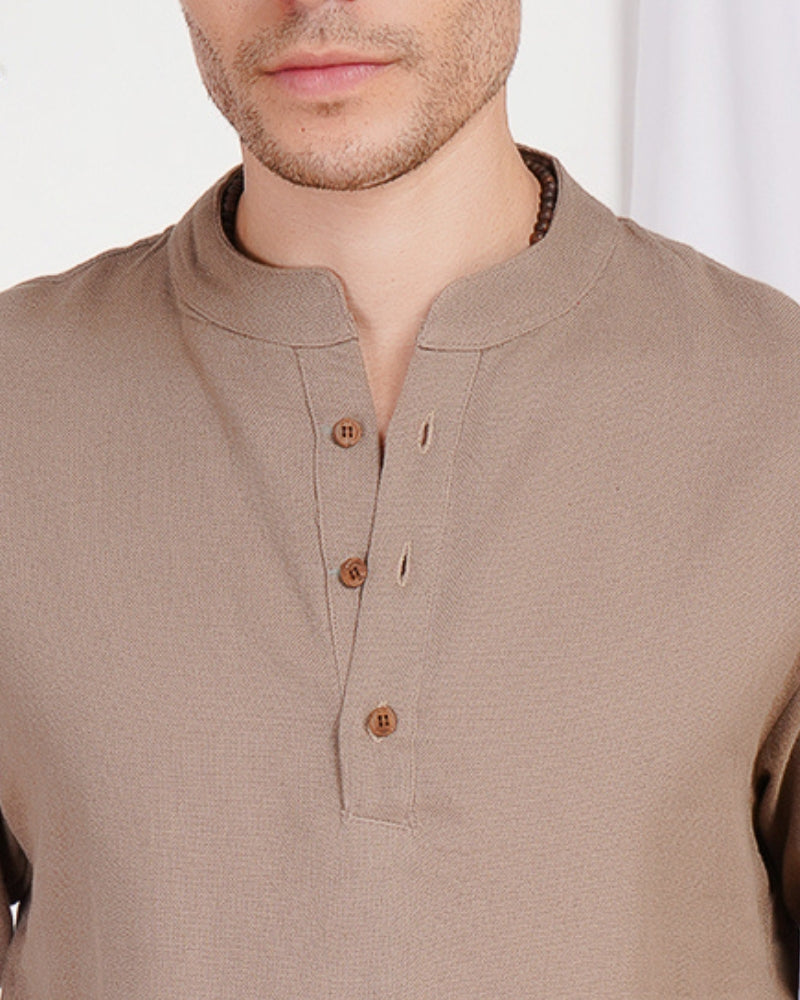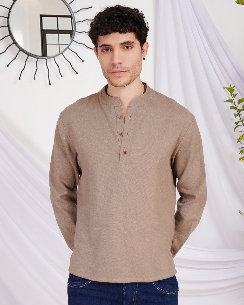 This bohemian long-sleeve shirt is crafted from ultra-breathable organic cotton that feels feather-light and grows softer with every wash. The earthy sand-tupe hue adds calm desert-sun charm, while the clean mandarin collar and half-placket keep it relaxed yet refined. A perfect everyday essential with breezy, boho ease.