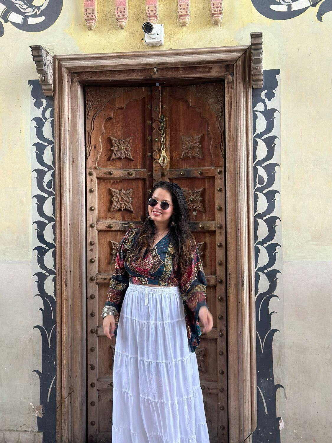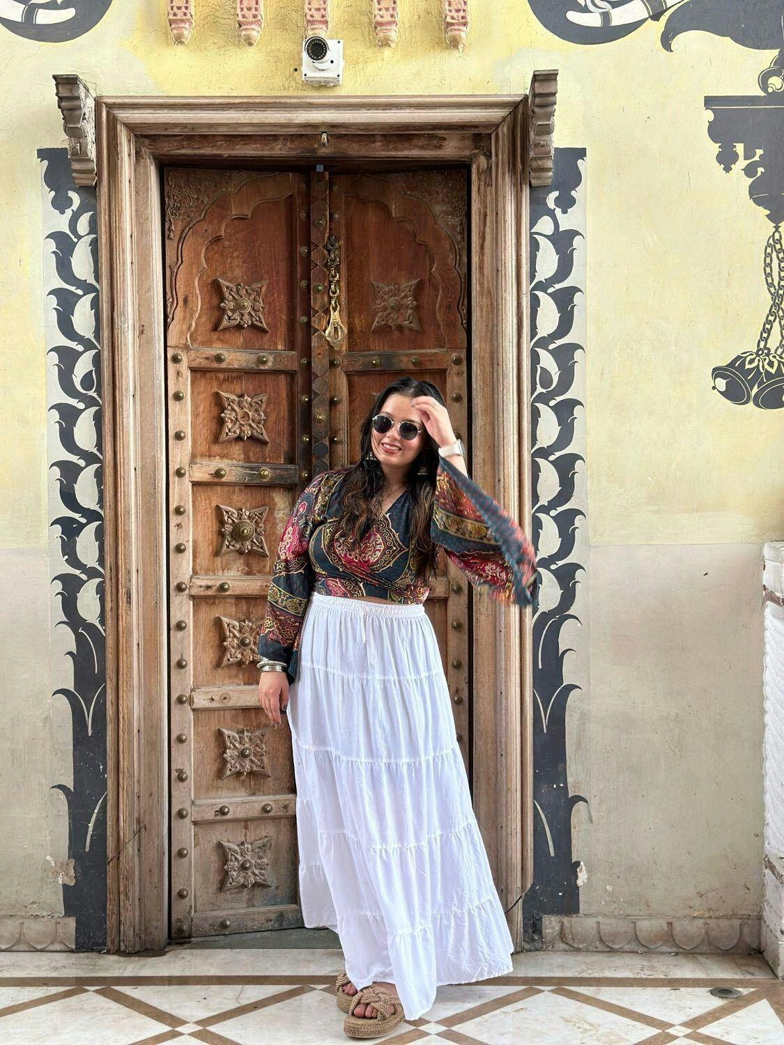This red and black bohemian top with golden foil paisley prints is a wardrobe must-have. Style it as a front knot for a bold look or tie it at the back for an elegant vibe. The balloon sleeves add a trendy touch. Pair with high-waisted jeans, chunky jewelry, and ankle boots for a night out, weekend brunch, or casual hangouts.