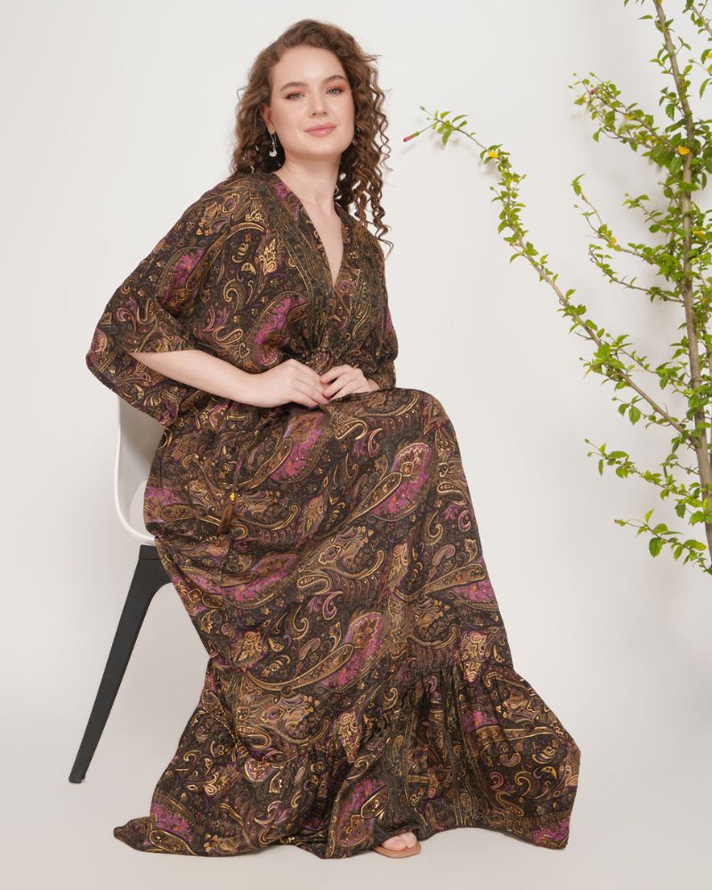 Wrap yourself in earthy magic with this dark brown bohemian maxi dress, lit up with purple hues and golden foil paisley prints. The short kimono sleeves and adjustable drawstring under the bust give you that easy, flattering fit. Pair with oxidised jewelry, tan flats, and a sling bag for sundowners, indie fests, or chai dates under fairy lights.